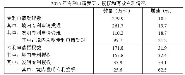 2015年,全國研究與試驗(yàn)發(fā)展經(jīng)費(fèi)支出14220億元,與國內(nèi)生產(chǎn)總值之比為2.1:100,其中基礎(chǔ)研究經(jīng)費(fèi)671億元。截至年底,全國共擁有有效專利547.8萬件,其中境內(nèi)有效發(fā)明專利87.2萬件,每萬人口境內(nèi)有效發(fā)明專利擁有量6.3件。