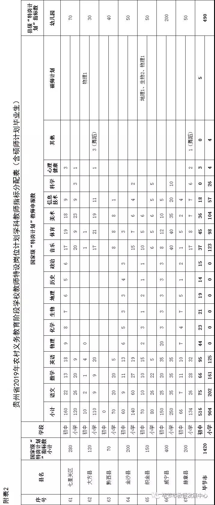 2019年全省安排“特崗計(jì)劃”指標(biāo)1910名在七星關(guān)區(qū)等7個縣(市、區(qū),下同),其中國家“特崗計(jì)劃”招聘1420名(含5名“碩師計(jì)劃”畢業(yè)生,具體名單見附表1,下同);縣級“特崗計(jì)劃”招聘490名,具體指標(biāo)分配詳見附表2。