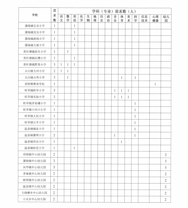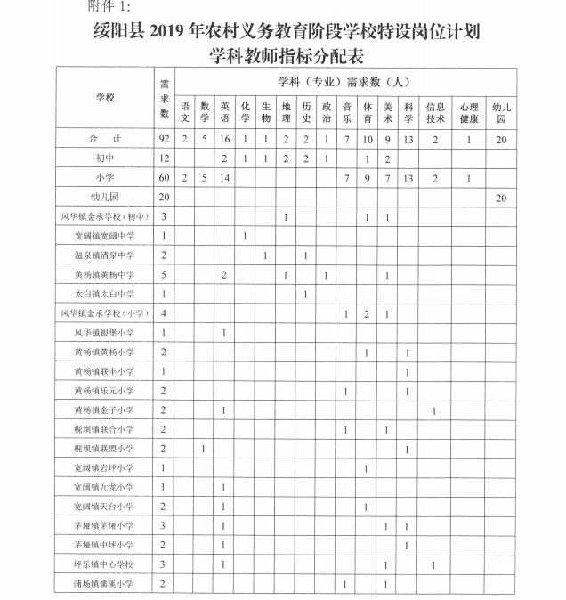 綏陽縣2019年農(nóng)村義務教育階段學校教師特設崗位計劃學科教師指標分配表