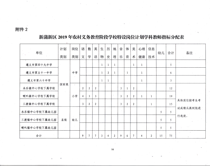 新蒲新區(qū)2019年農(nóng)村義務教育階段學校教師特設崗位計劃教師崗位分配表