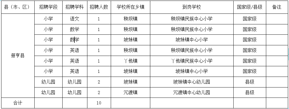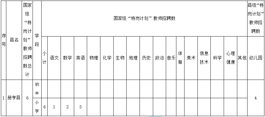 冊亨縣“特崗計劃”指標(biāo)10名(其中國家“特崗計劃”指標(biāo)6名、縣“特崗計劃”指標(biāo)4名,具體指標(biāo)分配詳見細(xì)則附件2)。