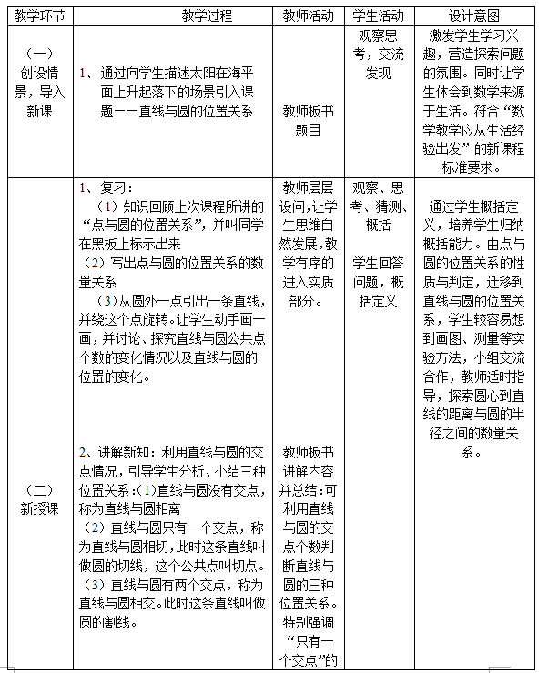 2.難點(diǎn):學(xué)生能根據(jù)圓心到直線的距離d與圓的半徑r之間的數(shù)量關(guān)系,揭示直線與圓的位置關(guān)系;直線與圓的三種位置關(guān)系判定方法的運(yùn)用。
