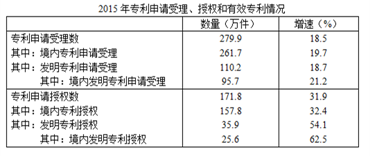 2015年,全國研究與試驗發(fā)展經費支出14220億元,與國內生產總值之比為2.1:100,其中基礎研究經費671億元。截至年底,全國共擁有有效專利547.8萬件,其中境內有效發(fā)明專利87.2萬件,每萬人口境內有效發(fā)明專利擁有量6.3件。