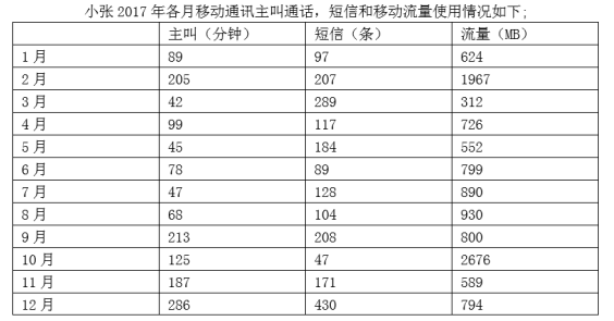 92、小張2017年主叫通話、短信和移動(dòng)流量均使用了套餐外服務(wù)的月份有幾個(gè)?